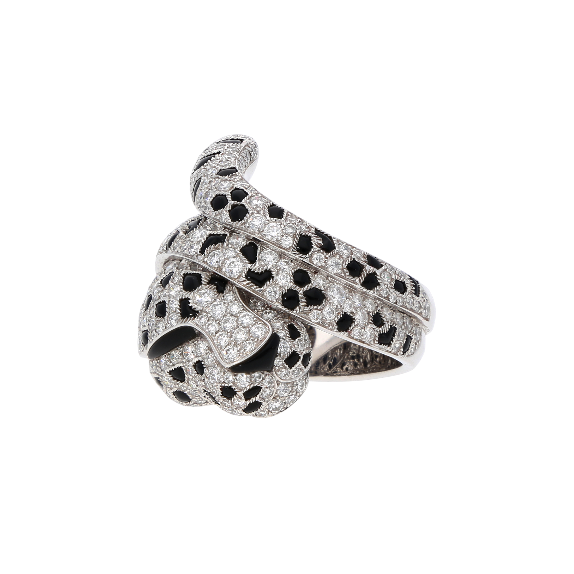 Kraftvoller Ring von Cartier aus der ikonischen «Panthère de Cartier»-Kollektion, entstanden um die Jahrtausendwende. Der plastisch gearbeitete Panther legt sich in dynamischer Bewegung um den Finger, ausgeführt in Platin und vollständig besetzt mit funkelnden Diamanten. Charakteristische Onyx-Einlagen formen das typische Fellmuster und verstärken den kontrastreichen Ausdruck dieser Skulptur im Miniaturformat.