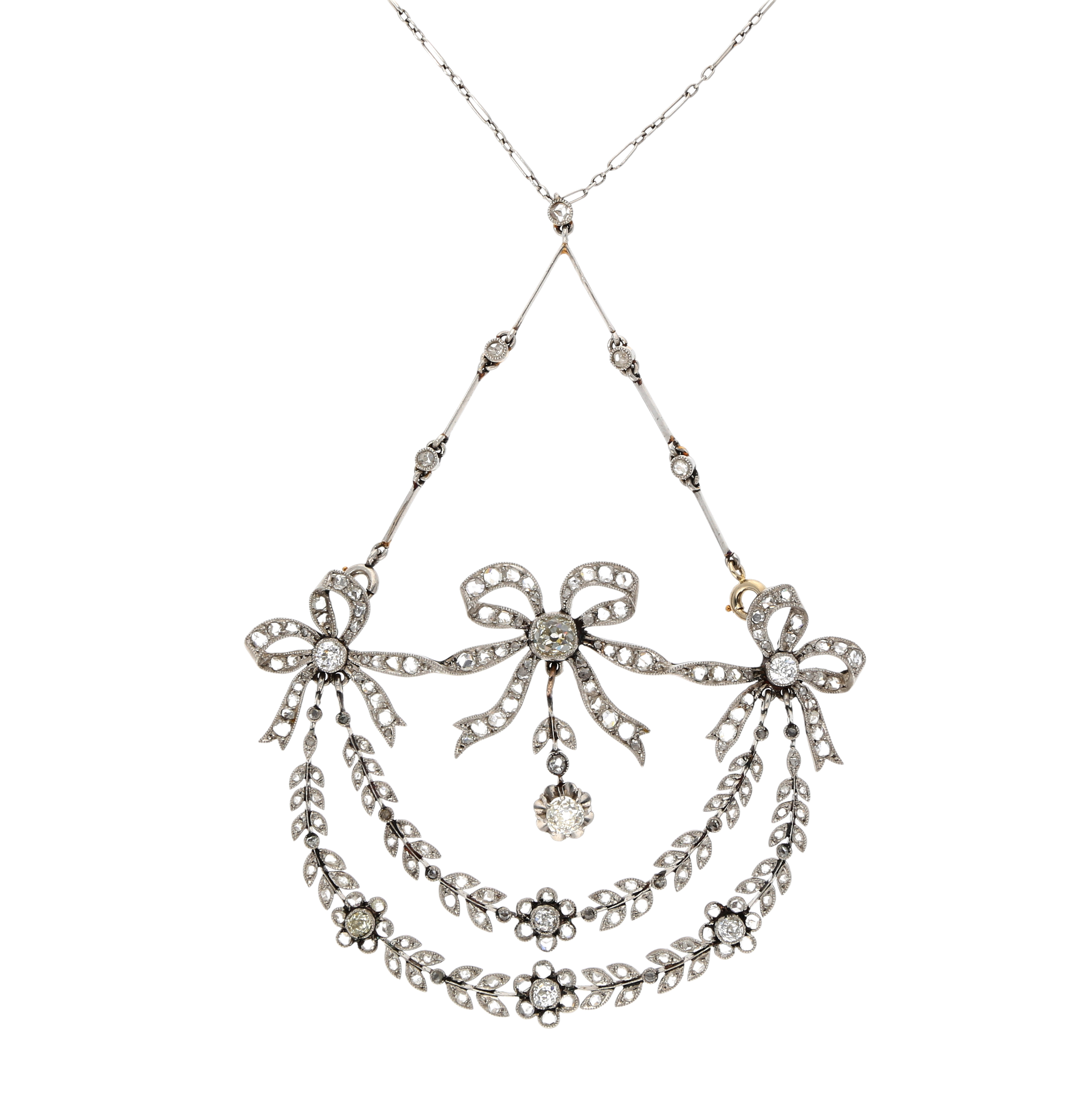 Erlesenes Collier aus der frühen Jugendstilzeit. Die zarte Komposition wird von drei symmetrisch angeordneten Schleifenmotiven bestimmt, die jeweils mit Diamantrosen und kleinen Altschliffdiamanten besetzt sind. Von ihnen hängen zwei elegant geschwungene Girlanden in Form von Blättern und Blüten herab, in der Mitte zusätzlich akzentuiert durch einen frei beweglichen Diamantanhänger.