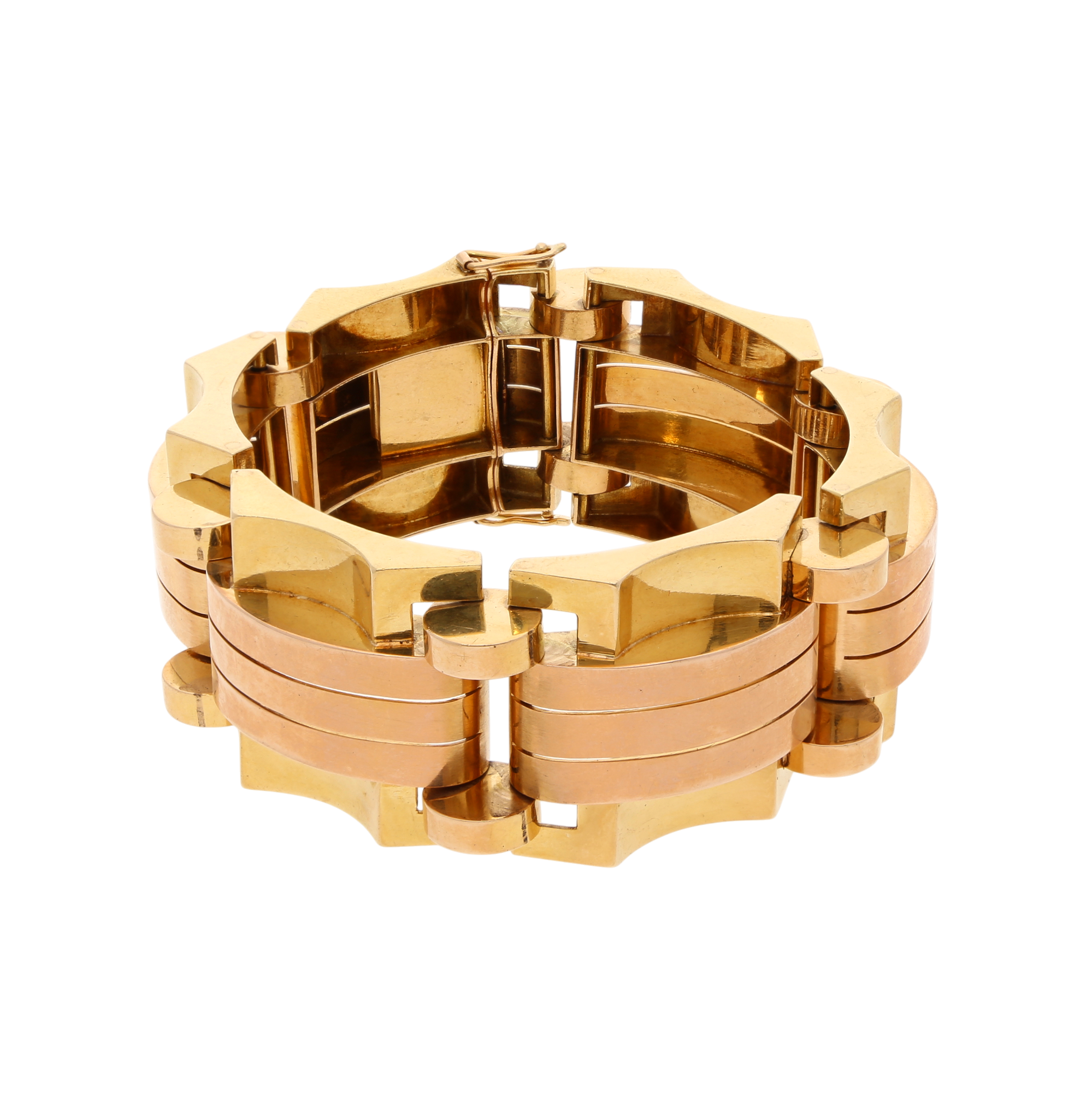 Markantes Armband aus der Retro-Zeit, um 1940. Gefertigt aus breiten, architektonisch geformten Gliedern in Rosé- und Gelbgold, die kraftvoll ineinandergreifen und ein plastisches Relief bilden. Die abwechselnden Farbnuancen des Goldes verstärken die dynamische Wirkung des Schmuckstücks, das durch seine monumentale Gliederung besonders eindrucksvoll erscheint.